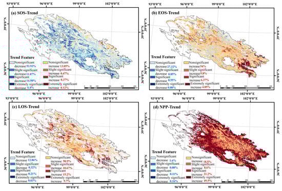 EOS mainly showed a delay trend, with 54% of the whole area showing a nonsignificant increase, 5.8% showing a slight significant increase, 6.37% showing a significant increase (p < 0.05), 4.85% showing an extremely significant increase (p < 0.01), and only 27.32% showed a trend of a nonsignificant decrease. LOS showed an increasing trend, with 50.9% being nonsignificantly increasing, 10.67% being slightly significantly increasing, 15.2% being significantly increasing (p < 0.05), 9.7% being extremely significantly increasing (p < 0.01), and only 12.86% showing a nonsignificantly decreasing trend, sporadically distributed in the northwestern part of the study area. NPP showed an increasing trend, with 49.5% showing an extremely significant increase (p < 0.01), 21.2% showing a significant increase (p < 0.05), and only 1.6% showing a nonsignificant decreasing trend.