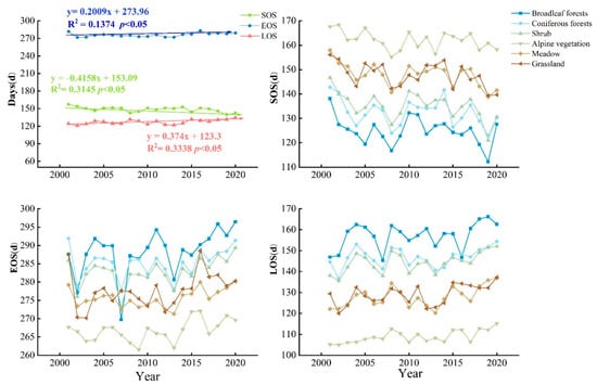 Figure 7 shows the interannual variation in vegetation phenology for the whole study area and different vegetation types. In 20 years, SOS showed the largest trend with an advance rate of −0.416 d/year, EOS showed a delayed trend with a delay rate of 0.201 d/year, and LOS maintained an increasing trend of 0.374 d/year. The interannual variations in different vegetation types in the region were different. For the SOS, each vegetation type exhibited an advancing trend, in the order of shrub (−0.482 d/year) > meadow (−0.445 d/year) > grassland (−0.414 d/year) > coniferous forests (−0.332 d/year) > broadleaf forests (−0.316 d/year) > alpine vegetation (−0.252 d/year), respectively. For EOS, each vegetation type showed a lengthening trend, in the order of broadleaf forests (0.492 d/year) > shrub (0.278 d/year) > grassland (0.275 d/year) > alpine vegetation (0.225 d/year) > coniferous forests (0.163 d/year) > meadow (0.146 d/year), respectively. For LOS, each vegetation type showed a lengthening trend, in the order of meadow (0.445 d/year) > shrub (0.442 d/year) > broadleaf forests (0.434 d/year) > grassland (0.422 d/year) > alpine vegetation (0.342 d/year) > coniferous forests (0.290 d/year).