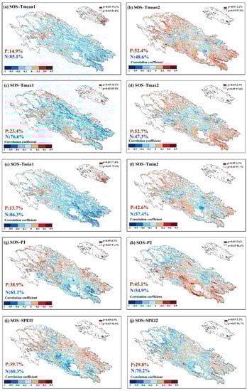 Figure 8 shows the response of spring phenology (SOS) to climatic factors in the spring of the current year and winter of the previous year. In terms of temperature, the SOS had negative correlations with the Tmean, Tmax and Tmin of the current spring, with values of 85.1%, 76.6% and 86.3%, respectively, and 19.2%, 10.1% and 27.6% reached significant negative correlations (p < 0.05). The SOS and the previous winter temperature showed more positive correlations of 52.4%, 52.7%, and 42.6%, respectively, and reached significant positive correlations (p < 0.05) of 2.2%, 2.4% and 2.3%, respectively. Compared with the spring of the current year, the response of the SOS to winter temperature was weak, and there were no strong significant relationships. In terms of precipitation, the SOS mainly showed a negative correlation with the current spring and the previous winter with 61.1% and 54.9%, respectively, and a smaller proportion reached a significant negative correlation (p < 0.05) with 4.3% and 3.6%, respectively. Similarly, there was some negative correlation between the SOS and SPEI, with 60.3% in the current spring and 70.2% in the previous winter, and there were significant negative correlations of 4.0% and 3.3%, respectively.