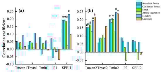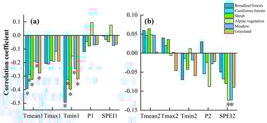 Correlations between autumn phenology of different vegetation types and preseason climatic factors. (a) Summer of the current year, (b) Autumn of the current year. * indicates significant correlation.