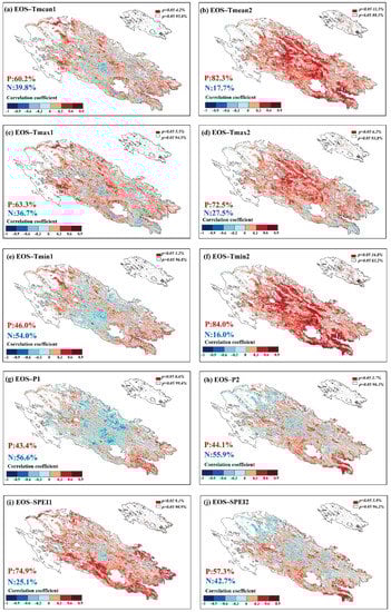 Figure 10 shows the response of autumn phenology (EOS) to climatic factors in the summer and autumn of the current year. In terms of temperature, the EOS had the positive correlations with the Tmean, Tmax and Tmin of the summer of 60.2%, 63.3%, and 46%, respectively, and reached a significant positive correlation (p < 0.05) of 4.2%, 5.5% and 3.2%, respectively. EOS and the temperature in the current autumn showed more positive correlations of 82.3%, 72.5%, and 84%, which reached a significant positive correlation (p < 0.05) of 11.5%, 6.2% and 16.8%, respectively. Compared with the current summer, the response of EOS to autumn temperature was more significant, especially for Tmin. In terms of precipitation, the EOS mainly showed a negative correlation with the current summer and autumn, with 56.6% and 55.9%, respectively, and reached a significant negative correlation (p < 0.05) of 0.6% and 3.7%, respectively. There was a positive correlation between the SOS and SPEI, with 74.9% in the current summer and 57.3% in autumn, and there was a significant positive correlation (p < 0.05) of 9.1% and 3.8%, indicating that drought in summer had a significant effect on the EOS.