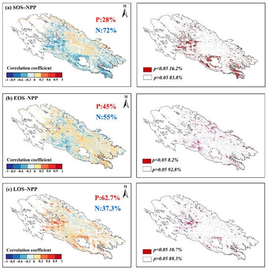 Figure 12 shows the correlations and the percentage of significant degrees between NPP and vegetation phenology. Among them, SOS showed a more significant negative correlation with NPP of 72% and a significant negative correlation (p < 0.05) of 16.2%, indicating that SOS had a more significant effect on the accumulation of NPP. The positive and negative correlations between the EOS and NPP were comparable at 45% and 55%, respectively, and the significant positive correlation (p < 0.05) was only 8.7%, indicating that NPP was less influenced by the EOS than by to the SOS. In contrast, LOS showed a more significant positive correlation with NPP at 62.7% and a significant positive correlation (p < 0.05) of 10.7%.