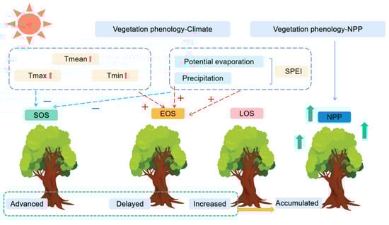 The above results suggested that the SOS and LOS are key factors influencing the increase in NPP accumulation, and that the SOS is closely related to climate change. Therefore, we need to consider the response mechanisms of vegetation phenology to climate change and the relationships with productivity to understand the dynamics of carbon balance in terrestrial ecosystems (Figure 13).