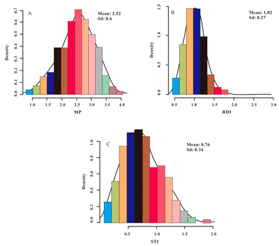 Density distribution of drought-tolerance indices of plant height. Density distribution of MP (A), density distribution of RDI (B), density distribution of STI (C).