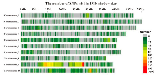 The number of SNP markers distributed on ten chromosomes was unbalanced, which resulted in different densities on each chromosome. The chromosome distribution is shown in Figure 2, in which gray represents no SNPs (gaps) in the 1 Mb range, green represents low density, and yellow and red represent medium and high density, respectively. With the deepening of red, its density increased. Chromosome 9 had the highest density with red and yellow regions, among which the yellow region accounted for a large proportion. The density of chromosomes 10 and 5 was relatively high. In addition, there were many obvious gaps in each chromosome, which might be related to chromosome structure and population composition.