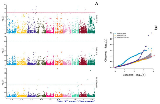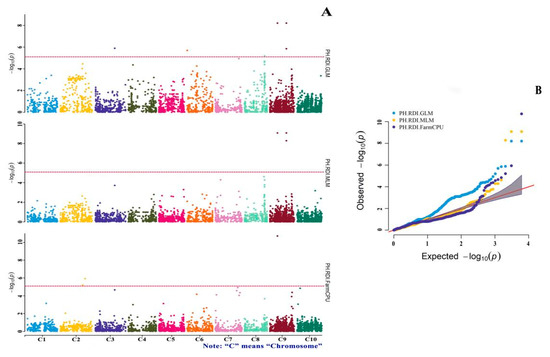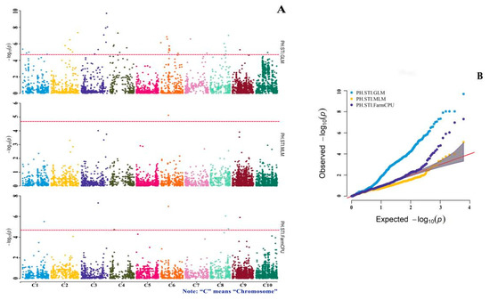 To determine the significant loci of drought tolerance, this study used three models for the GWAS. Among them, the GLM introduced population structure “Q” as a covariate to control false positives. The equation can be conceptually expressed as y = Q + si + e, where “si”, “y”, and “e” are the ith marker, phenotype and residuals, respectively. Q was represented by the PCA results of molecular markers covering the whole genome. The first three PCs were introduced in this study. The MLM introduced the Q (PCA results) and K (genetic relationships between varieties) matrices to control false positives. The equation can be conceptually expressed as y = Q + K + si + e. From the quantile–quantile (QQ) plots of the GWAS (Figure 4B, Figure 5B and Figure 6B), it can be seen that the blue line of the GLM algorithm that only considers Q began to rise from the starting position, and the genome expansion factor was greater than 1, which indicates that population stratification needs to be corrected, which is a cause of false positives [28]. In contrast, by considering the Q and K matrices, the MLM controls false positives and p-value inflation well [29,30,43]. However, for complex traits related to Q, the signals of known genes also disappear into the background, which weakens the true association [33]. The third model was FarmCPU, an algorithm that iteratively uses fixed and random effects. The equation can be conceptually expressed as y = si + S + e (fixed model) and y = u + e (random model), where “S” represents pseudo-quantitative-trait nucleotides as additional covariates, and “u” represents individual genetic effects with the variance and covariance matrix [33]. From the QQ plots of the GWAS (Figure 4B, Figure 5B and Figure 6B), it can be seen that the purple line representing FarmCPU was very close to the theoretical value, better controlled the expansion of the p-value, and the genome expansion factor was near 1. This study showed that FarmCPU had no obvious false positive or false negative values, and more micro-effect genes were captured without weakening the statistical effect. From the results of this study, 49, 5 and 25 significant SNP loci were detected by the GLM, the MLM and FarmCPU, respectively, which also demonstrated the difference in SNP detection among these three models. In addition, the results showed that many loci were detected by two or more models. The SNP-8-42803746 marker identified by the PH MP index, the SNP-3-48129228 marker identified by the PH RDI and the SNP-2130476 and SNP-3-48129228 markers identified by the PH STI were detected by the GLM and FarmCPU. SNP-6-21397577 identified by the MP index and SNP-6-21397577 identified by the STI were detected by the MLM and FarmCPU, respectively. SNP-9-40211466 and SNP-9-40211299 identified by the RDI were detected by the GLM and MLM, respectively. SNP-9-18625001 identified by the RDI was detected by the GLM, the MLM and FarmCPU. The results of these co-detected markers were relatively reliable.