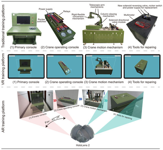 The traditional training platform can support fault transplantation and actual maintenance and the teaching and examination process is realized in the actual use process. For the VR training platform, all the devices and components are modeled and placed in the 3D virtual space based on a tablet computer. The specific model of the device is a Huawei Matepad 11. According to Daling’s definition of this interaction mode [4], it is specifically named VR interaction based on monoscopic screens. The AR training platform was built in an empty room (Xi ‘an, Shaanxi Province, China) based on a HoloLens 2 HMD device from the Microsoft Corporation (Redmond, WA, USA) and the virtual 3D models were placed in the real space. The size of the virtual models is the same as that of the actual equipment. Users can walk around in the space wearing the HoloLens 2. Based on the real-time registration and tracking principle of the device, these 3D models will remain relatively stationary with the actual space and users can browse the details of the models and operations by walking and rotating the visual angle.