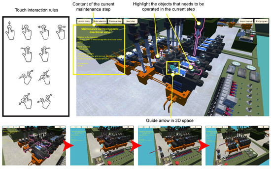 The maintenance training based on VR and AR training platforms is realized in the form of animation and an interactive dialog box. The VR maintenance training scenario is shown in Figure 3. The user can receive the step text description from the upper left corner in the interface, the object involved in the current step will also be highlighted, and the maintenance method will be conveyed in the form of an animation, which shows the animation of the disassembly and replacement of the electromagnetic directional valve. In the 3D space of VR, an indicating arrow will be provided, which can guide the user to adjust the angle of view to the correct direction when the user’s angle of view is not on the relevant object of the current step.