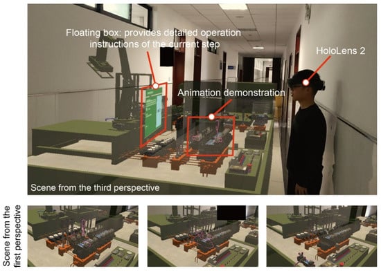 In the AR training interface, visual guidance is a commonly used auxiliary strategy [32]. Highlighting, clues, 3D models, and animation enhancement methods are added to the AR training environment. This kind of real and dynamic 3D visual visualization can help trainees understand the space more easily [33], thus achieving better training effectiveness. The AR training ground scene in this study adopts the combination of highlighting, animation, and 3D models to enhance learning. As shown in Figure 4, trainees learn the current step by watching the animation demonstration and the objects to be operated in the space will be highlighted and prompted. Trainees can see the detailed instructions of the current step in the floating window, such as the names of operating objects, operating methods, and precautions. These instructions will also be broadcast to trainees in the form of voice.