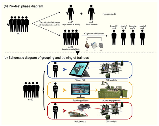 This experiment recruited 77 postgraduate students majoring in telecommunications, aged 22–31 years (M = 24.43, SD = 1.720), all male, with normal or corrected visual acuity, no color blindness, color weakness, and right-handedness. No female trainees were involved in this experiment for objective reasons of the academy. The experiment scheme is shown in Figure 5. Figure 5a shows the screening process of the trainees. First, through the technical affinity test, the obtained test scores can be used to screen out possible individuals with a high technical affinity through the data analysis method of systematic clustering. For the remaining individuals, a cognitive ability test is needed, and the scores of cognitive ability test will be used as covariates in one-way covariance analysis in order to reduce the influence of individual cognitive differences on the experimental results. Figure 5b shows the situation of personnel grouping and the schematic diagram of the training mode of each group.