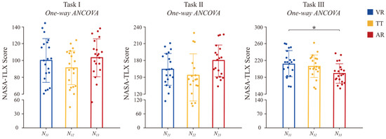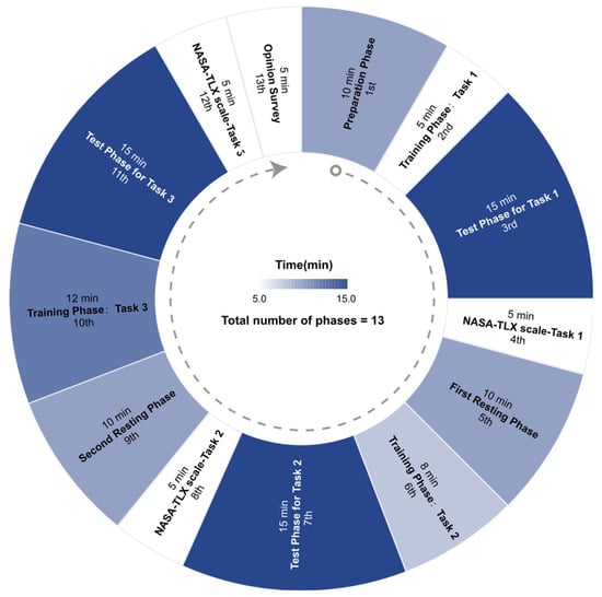 First, a pre-test experiment was conducted to select individuals without AR experience and measure the cognitive ability of the experimental individuals. The number of operation steps of each trainee was measured by the cognitive ability experiment, which was used to measure the result of the combined effect of human factors. Then, the trainees entered the training preparation stage. The experimental steps and durations are shown in Figure 6. The trainees were equally divided into AR, TT, and VR groups and provided with a 10 min training lecture so that they could adapt to their respective training systems as much as possible and prepare for the training equipment to be used. After the preparation, the trainees completed the training and assessment tasks based on their respective training platforms. Each completed task assessment completed a NASA-TLX scale. The trainees could rest for 10 min before proceeding to the next task. After completing all tasks, the trainees in VR and AR groups were subject to opinion polls.