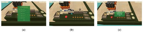 Figure 7. Cognitive Ability Test. (a) Interface for selecting mission level. (b) Prompt the trainee to the object that needs to be operated in the current step, which will last for 5 s. (c) Assessment results, including time, number of correct and incorrect. - The operation elements of each level are randomly arranged and combined by three basic elements of Qr, Qcb, and Qrs, the number of operation elements in level 1 is X1 = 3, the number of operation elements in level n is Xn = Xn−1 + 1, n ≥ 2.