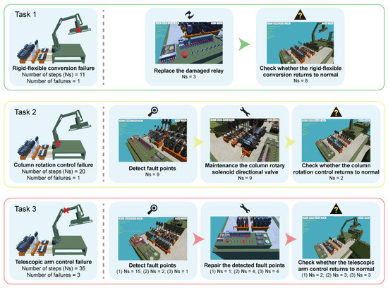 As shown in Figure 8, three tasks with different difficulties are set in training and assessment, which involve different maintenance steps, such as detection, replacement, repair, and calibration. The figure shows the number of steps and descriptions for each process. The difficulty of the task is defined by the number of steps and the number of failures.