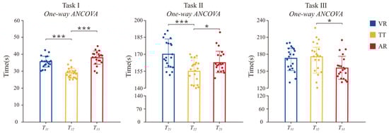 The detailed results for the time parameter T are presented in Appendix B, Table A3. Tij represents the execution time of the jth group under the ith task. The Shapiro–Wilk test results showed that variables T1, T2, and T3 were in normal distribution (p > 0.05). The Levin’s statistical results and inter-subjective effect test results show that T1, T2, and T3 variables satisfy the hypothesis of homogeneity of variance (p < 0.05) and homogeneity of slope (p > 0.05).