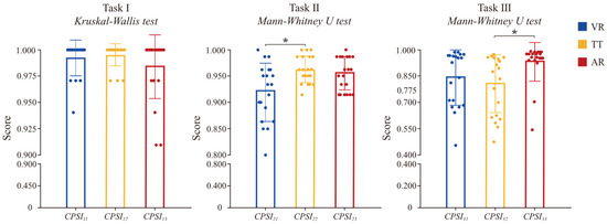 Descriptive statistics of the CPSI scores of the three groups in Task 1 to 3.