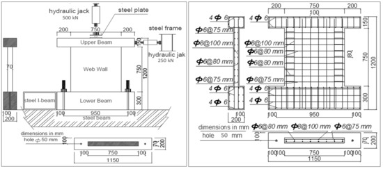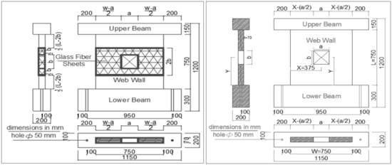 All RC shear walls were cast with the same dimensions of 750 mm width, 750 mm height (hw/lw = 1), and 70 mm thickness, monolithically connected to an upper and lower beam. These dimensions were tested by Lefas et al. [38]; the arrangement of opening and the scheme of the applied GFRPs were proposed by Behfarnia et al. [39]. The upper beam dimensions (1150 mm × 200 mm × 150 mm) functioned as the element through which axial and horizontal loads were applied to the walls and as a cage for the anchorage of the vertical bars. The lower beam dimension (1150 mm 200 mm 300 mm) was utilized to clamp the specimens down to the laboratory floor. Concrete dimensions, the location of hydraulic jacks, and the reinforcement details are shown in Figure 4. All specimens were divided into four main groups based on the opening location. The first group N has no opening, the second group B has openings at the bottom, the third group M has openings in the middle, and the fourth group T has openings at the top. Square-shaped openings were installed and varied in size (L/4, L/3, and L/2) (L corresponded to the length of the wall). Table 6 and Figure 5 illustrate the geometry of the shear wall, arrangements of openings, and the dimensions of the applied GFRP sheet around the opening.