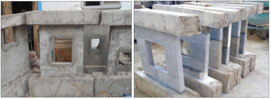 Figure 6 describes the preparation of wooden frames and the steel reinforcement cages. The vertical and horizontal reinforcement was designed by the recommendation of the ECP-203 [2], and more horizontal stirrups were added to confine the wall edges and enhance strength and ductility. Electrical strain gauges with lengths of 10 mm and 120 Ohms resistance were attached to the reinforcing bars, as demonstrated in Figure 7. Three linear variable differential transformers (LVDTs) were utilized to measure displacement at various locations. The specimens’ shape before and after strengthening is illustrated Figure 8. After the working load was applied, the cracks of the walls were repaired, and then, the FRP sheet was installed.