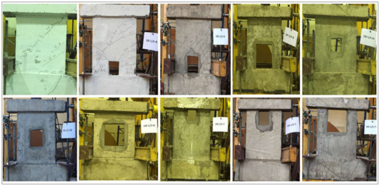 Figure 11 shows the crack development of the ten tested shear walls before strengthening. For the control solid shear wall, the first crack was a tension crack of the concrete that appeared horizontally at the right bottom of the wall due to an applied lateral load of 65 kN, and this cracking pattern is usually the same for all squat solid shear walls [35]. The effect of these cracks on wall stiffness is very small and can be ignored [40]. As the lateral load increased, the first diagonal crack was formed, and then, the tension-steel yielded and caused a larger diagonal crack (corner-to-corner), and this developed diagonal cracks resulting in diagonal shear failure at a load of 190 kN. The presence of the top beam helps in redistributing the shear load and controls the sudden failure after the development of the cracks, and this failure mechanism matches with the research of Paulay et al. [41], who studied the behavior of squat shear walls.