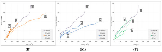 Lateral load versus lateral displacement curves for groups (B), (M), and (T) before strengthening.
