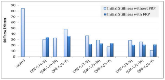 Despite GFRP sheets’ effectiveness in improving load and displacement capacity, this positive contribution was still insufficient to bring it up to the capacity of RC shear walls without openings. This is a result of post-construction cut-out openings, especially those with large sizes, which weaken the integrity and stiffness of the wall by reducing the resistant concrete and the reinforcement ratio as well as affecting the reinforcement configuration.