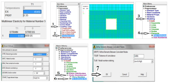 In this paper, the ANSYS parametric design language (APDL) finite-element program is used to simulate the behavior of GFRP-strengthened RC shear wall under static loading; the FE technique is a cost-effective numerical method for solving difficult physical problems with acceptable approximation [27]. Recently, the analysis of nonlinear fracture mechanics in FE has been developed; the cohesive zone model (CZM) is a simple method that uses a contact element to describe the interface surfaces of two materials [28,29]. Muhammad et al. [30] used ANSYS for modeling the shear wall with varying percentages of base opening. It was reported that the stiffness degradation is quite low, up to 50% base opening. Beyond this limit, the rate of decrease in strength and stiffness is excessive.