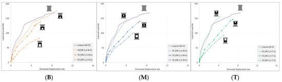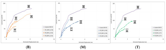(LVDT) were used to measure lateral displacement; Figure 13 and Figure 14 illustrate the relationship between the applied lateral loads versus the horizontal displacement at the top of the described tested shear walls before and after strengthening, respectively. From the figures, it can be seen that the load-deflection curves of all specimens behave in the same manner. Initially, the load-deflection curve remained elastic till reaching the cracking load, and then, the relation started to be more curved until reaching the ultimate load and, finally, the failure stage. At the three studied locations, the slope of the curve decreased as the opening size increased owing to the degradation in the stiffness and rigidity. After strengthening, the slope of the curves and the lateral load capacity increased due to the ability of the applied GFRP sheets in controlling stress redistribution and crack propagation. The displacement capacity of the walls with the opening was lesser than that of the reference wall without opening, but it was improved by applying GFRPs around the opening; in this way, a much more ductile load-displacement response can be obtained.