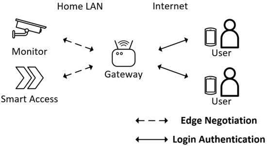 Figure 1 shows the system model of Guo et al.’s scheme. The communication system consists of smart devices, users & mobile devices, a smart gateway, and the cloud. The smart device is connected to the smart gateway via the home network, such as Wi-Fi and wired network. The smart gateway is connected to the cloud via the internet, and users can access the smart gateway remotely. The smart gateway provides computing and storage resources in the communication system to ensure real-time data transmission. The smart gateway in this architecture is responsible for collecting from smart devices and processing user requests. The entity negotiation model is shown in Figure 2.