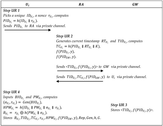 Step UR1: inputs a unique identity and biological information into mobile device . generates a nonce , and computes a pseudo-identity , [32], , . The message is sent to via a private channel.