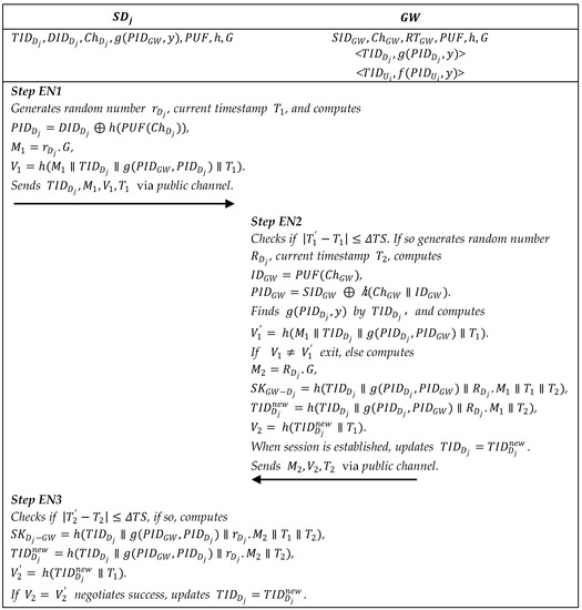 Step EN1: The smart device sends message to the smart gateway via the public channel, where is current timestamp and is a random number.