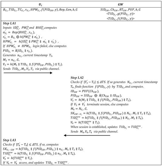 Step LA4: When receives the message from , . checks the freshness of the timestamp . Then computes , , . If , terminate. Otherwise, generates a random number and current timestamp , and computes , , , . Subsequently, chooses a new random number and computes . Finally, sends to .