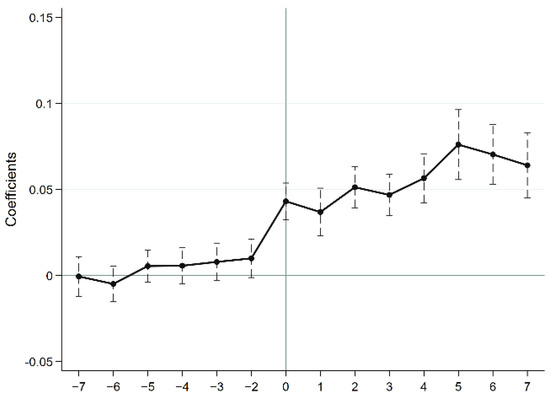 where the first IPMP pilot city is in 2012, and the latest is 2019, so the value of k ranges from −7 to 7. In the specific regression analysis, this position takes , i.e., the 7th year before the pilot policy, as the base period, by comparing the coefficients in Model (2) to assess the dynamic impact on GTFP before and after the IPMP pilot city.