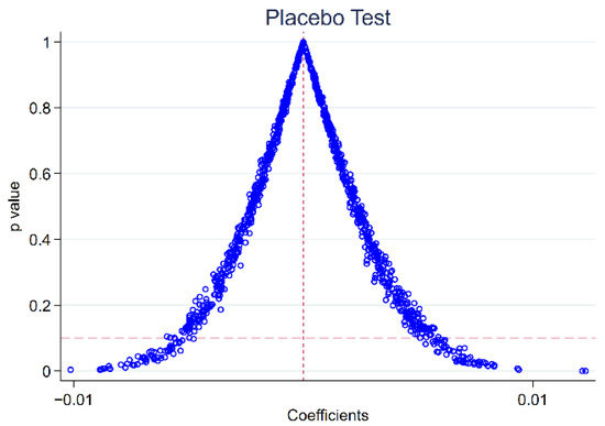 To verify that the promotion effect of IPMP on GTFP was not caused by other random factors, a placebo test was conducted by re-randomizing the treatment and control groups with reference to the study of Cai et al. (2016) [47]. First, 64 cities were randomly selected separately as the new experimental group and the remaining cities as the control group to construct the spurious pilot policy DID term . Second, based on the spurious pilot policy DID term , regression estimation was performed according to Model (1), and the above process was repeated 1000 times to simulate obtaining 1000 estimated coefficients.