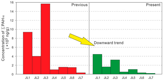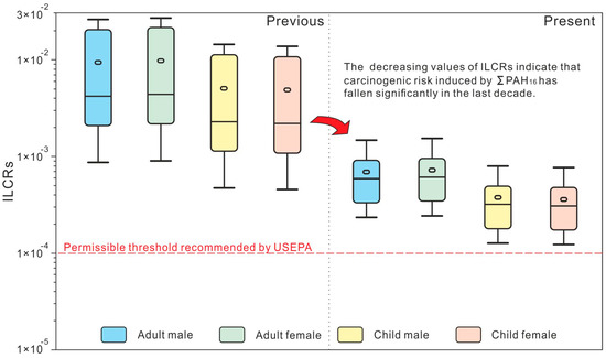Compared with the past, carcinogenic risks caused by the present samples show a marked decline by 1 to 2 orders of magnitude (Figure 6). Although ∑PAH16 concentrations have fallen in the last decade (Table 1, Figure 2), their degree of decrease cannot match that of ILCRs. The latter is caused by the amplification effect of the toxic equivalent factors (TEFs) employed in ILCR calculations. Decreasing concentrations of BaP and BbF (their TEFs are 1.0 and 0.1, respectively) mainly facilitate a substantial decline of carcinogenic risks with average rates of 98.39% and 91.20%, respectively, despite slight elevations of concentrations of other individual PAHs with high TEFs values (TEFs = 0.1) (e.g., BaA, BkF, IcdP and DahA). Moreover, variations of PAHs with lower TEFs values (TEFs = 0.01 or 0.001) (e.g., Nap, Acy, Ace, Fl, Phe, Flu, Ant, Pyr, Chr and BghiP) are more difficult to influence the final result of ILCRs. Although the ILCR values have decreased considerably when compared with the past, carcinogenic risks remain severe, suggesting that proactive measurements are of the utmost requirement.
