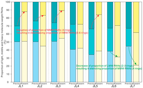 In terms of PAH profile, the result of the paired-sample t-test indicates that variation of proportion of MMW-PAHs shows a statistically significant increase (Table 2). For the paired-sample t-test, when Sig. < 0.05 (two-tailed), it means null hypothesis of the model is refused, suggesting that a statistically significant difference exists. In addition, when t < 0, it means the concentration of a certain item in the present sample increases when compared with the past; otherwise, it indicates a decline. Variation of PAH profile between previous and present samples is shown in Figure 3. Compared with the past, proportions of MMW-PAHs in the present coal gangue sample increase together with a decreasing proportion of HMW PAHs, while the proportion of LMW-PAHs remains unchanged. This pattern of change is inherited by JL2, JL3 and JL5, which are within 1 km away from the coal gangue dump, while JL4 shows an almost identical profile of PAHs. The other pattern is identified in the rest of the samples that are further away from the coal gangue dump (JL6 and JL7), namely that proportions of MMW-PAHs increase in the present samples, which is accompanied by the decline of LMW-PAH proportions. These samples could be subject to the contamination of PAHs from other potential sources.