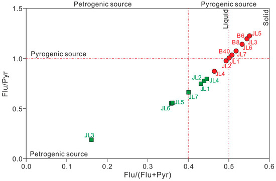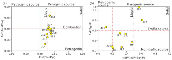 (a) Plots of Flu/(Flu + Pyr) vs. Ant/(Ant + Phe) and (b) IcdP/(IcdP + BghiP) vs. Bap/BghiP in the present samples (the outliers are not displayed in the plot).