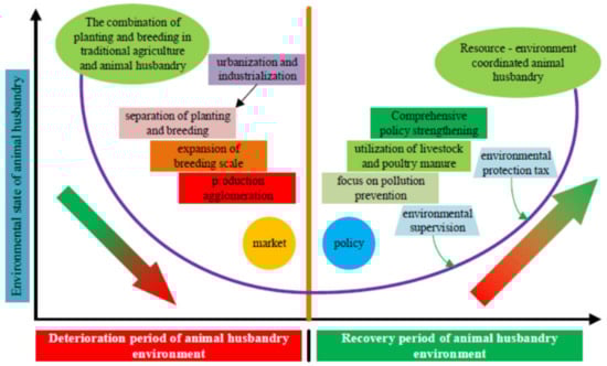 Animal husbandry is an important source of animal protein for human nutritional needs and has a far-reaching significance for enriching agro-food systems and the agricultural economy. The rapidly expanding demand for consumable livestock products has correspondingly stimulated livestock production, which has led to a series of serious problems, such as resource shortages and environmental pollution. Such problems are particularly prominent in nations that use traditional farming methods, as well as those with limited animal husbandry resources and poor environmental endowments [1,2,3]. In recent decades, the rapid development of animal husbandry in China has solved the consumption shortage of animal proteins, such as meat, egg, and milk. However, the expansion of the breeding scale has also caused severe resource and environmental problems, and the unsustainable development of animal husbandry has gradually emerged. To eliminate the contradiction between environmental protection and the development needs of animal husbandry and resource supplies, the Chinese government has implemented a set of environmental protection policies, such as pollution discharge fees and environmental taxation, to impose restrictions on the production behaviors of breeding companies, as well as measures that encourage the green transformation of traditional husbandry, such as tax reductions and exemptions, assistance for the establishment of corresponding facilities, and financial incentives [4].