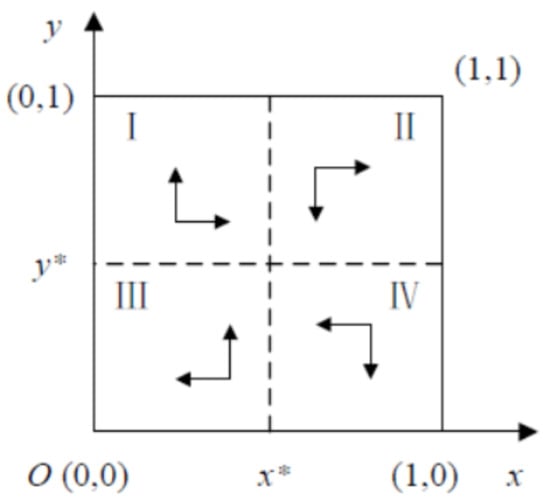 According to the embedded assumptions, any initial or evolved points need to be in a two-dimensional space ; that is, and , which can be interpreted as the equilibrium condition for the replicator dynamic system. Table 3 presents the numerical expressions and ESS of the equilibrium points. The matrix determinants of the equilibrium points (0, 0), (0, 1), (1, 0), and (1, 1) are negative; hence, these four points are saddle points.