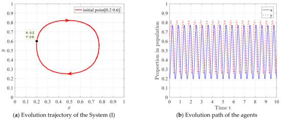 Referring to Liu et al. [38], the periodic fluctuation of System (I) can be interpreted, and the motion trajectory of the replicator dynamics equation at the center point (, ) is