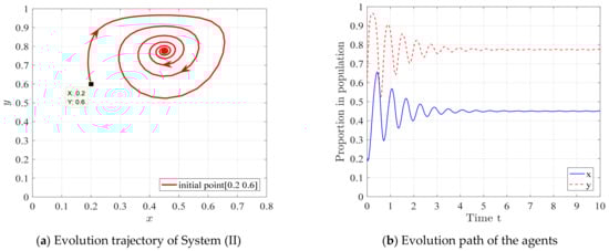 Any initial and evolved point needs to be in two-dimensional space , where and , which can be interpreted as the equilibrium condition for the replicator dynamic system. By calculating the matrix determinant and trace corresponding to the equilibrium points, equilibrium points (0, 0), (0, 1), and (1, 1) are indeed the saddle point, and (1, 0) is an unstable point. Substituting the central point (, ) into the Jacobian matrix shows that the characteristic roots of the matrix ( and ) are a pair of characteristic complex roots with negative real components. Thus, System (II) has asymptotic stability, and the evolutionary trajectory approximates a stable equilibrium point (, ). This concludes the proof. □