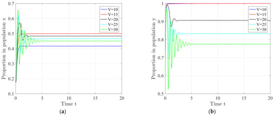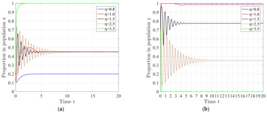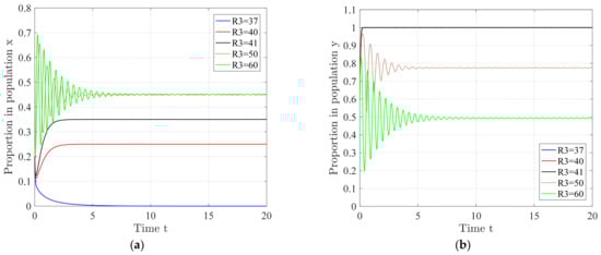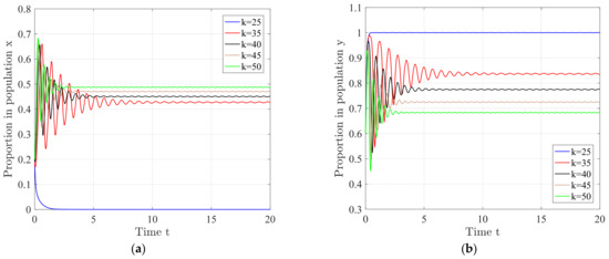 The eigenvalues and of the equilibrium point (, ) in the above formula are imaginary roots. According to the studies of Taylor and Jonker [36] and Morin and Samson [37], (, ) is the central point (stable equilibrium point) of the two-dimensional nonlinear dynamic system; however, it is not the asymptotic ESS. This concludes the proof. □