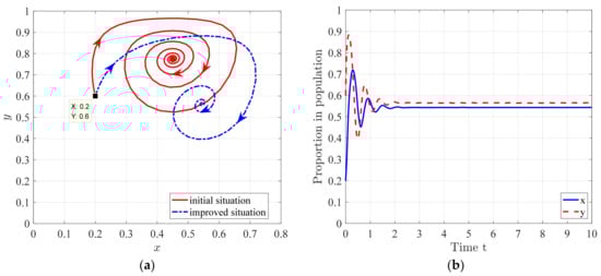 Simulation results at the initial stage and that following improvement. (a) Evolution trajectory of System (II) at the initial stage and following the improvement. (b) Evolution trajectory of both players following the improvement.