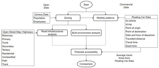 The study adopts different sources and types of data for the analysis: open data (census data; Open Street Map database—OSM) and GPS traces data from a fleet of privately owned probe vehicles traveling across the three cities (Floating Car Data—FCD) (Figure 1).