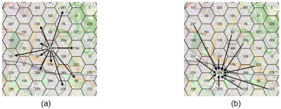 The concept of accessibility is well-known []. Accessibility can be defined as the easiness to reach activities from a starting zone or to be reached from several zones through transportation infrastructures and services. Several formulations have been defined for accessibility as a function of the selected variables [,], for example, based exclusively on the performance of the transportation supply or based on the spatial distribution of activities and on the cost to reach them. The proposed formulation for accessibility is inspired by the gravitational law [], considering socioeconomic characteristics such as the attractive mass and the travel time between zones []. Particularly, two potential accessibility metrics are computed: (i) the active one (Figure 2a) that measures the possibility to reach several destinations and using their activities for a given zone; (ii) the passive one (Figure 2b) that measures the possibility for a given zone to be easily reached from the inhabitants of several origins.