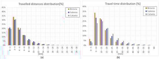 Moving to traveled distances and travel times, the average of traveled distances per trip in the whole month (thus, despite the time interval and the specific day, if weekday or weekend) is equal to 4.64 km for Brescia (median 3.7 km, standard deviation 3.53 km), 5.17 km for Catania (median 3.9 km, standard deviation 4.27 km), and 5.05 km for Salerno (median 3.8 km, standard deviation 4.11 km). According to these metrics and as shown in Figure 3a, Brescia has 34% of trips with a traveled distance between 2 and 4 km, while datasets of Catania and Salerno have, respectively, 31% and 30% of trips belonging to this class, showing a stronger trend of Brescia for low distances than in the other two cities. This confirms a more compact city structure for Brescia or at least a more mixed one.