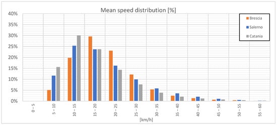According to the distribution of Figure 4, mean speeds in the database of Brescia are concentrated in a medium speed range, 30% of trips experience an average speed between 15 and 20 km/h, while trips in the database of Catania are concentrated in lower-speed classes (between 10 and 15 km/h). If the observed speeds are analyzed according to the peak hour in the morning, previous values are amplified as they reach 16 km/h for Catania, while higher ones (about 19 km/h) are reached for both Brescia and Salerno.
