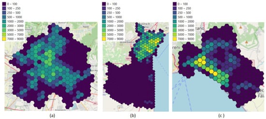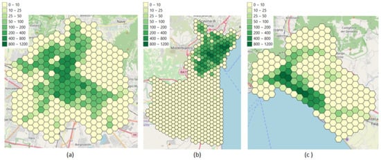 According to Figure 1, each city is divided with a regular hexagonal grid (side of length 500 m) in order to obtain normalized maps without irregular shapes and to perform standardized comparisons between different urban contexts. Thanks to its flexibility and generalization feature, this approximation has been used in several research contexts, such as the spatial accessibility analysis [,,], where the availability of transport data collections is still growing [,]. Despite its higher computational complexity, hexagonal cell tessellation is able to cover an entire geographical region without any gaps and overlapping, ensuring a greater mapping accuracy with respect to other methods (e.g., circular or square shapes). Moreover, the method allows a better distribution of centroids, an optimal management of nearest neighborhoods, an easy matching of curve patterns, and irregular territorial boundaries.