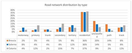 Moving to the road network structure (Figure 6), in the three cities, the main road type is the residential street covering more than 35% of the total network kilometers. Catania and Salerno have higher percentages of high-speed roads (motorway and primary) than Brescia. The Gini index of the road network is 0.26 for Brescia, demonstrating a more uniform distribution of the street network, while the Gini indexes for Catania and Salerno are, respectively, 0.57 and 0.44. Brescia has, in general, more roads for penetration in the city center than the other two cities. Salerno has in its municipality an important motorway—the A2 Salerno-Reggio Calabria.