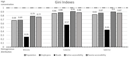 As seen in the results section and summarized in Figure 8, potential accessibility indicators have slightly higher values of Gini indexes with respect to those of their respective variable (e.g., passive accessibility with population and active accessibility with employees). If the potential accessibility is higher than 0.8 (see Catania and Salerno, Figure 8), approximately the same values are obtained for population and employees’ distribution. Brescia shows a reduction of approximately 0.1 between the Gini index of the potential accessibility and the related socioeconomic factor. This result can be summarized, postulating that more homogeneous conditions in terms of population and employees imply a higher possibility to reach a high level of accessibility on the whole city.