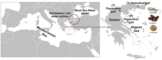 The method used for the collection of animals is explained in detail in Feidantsis et al. [30,31]. S. officinalis, H. tubulosa, and V. verrucosa were collected from the Thermaikos, Pagasitikos, and Vistonikos gulfs (Figure 1). Individuals of the examined species were sampled between 10 and 21 April 2018, 7 and 15 June 2018, 4 and 12 November 2018, and 6 and 11 January 2019. The examined species (6 individuals per gulf per species = 18 individuals per species) were collected by divers and local fishermen (0–10 m depth). Immediately after species sampling, individuals were dissected with high precision anatomic tools, and tissues were immediately placed in DNase- and RNase-free Eppendorf tubes, and thereafter frozen in liquid nitrogen. The frozen samples were transferred to the laboratory, where they were stored at −80 °C for genetic analysis.