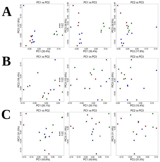 Principal Component Analysis for (A) Holothuria tubulosa, (B) Sepia officinalis and (C) Venus verrucosa.